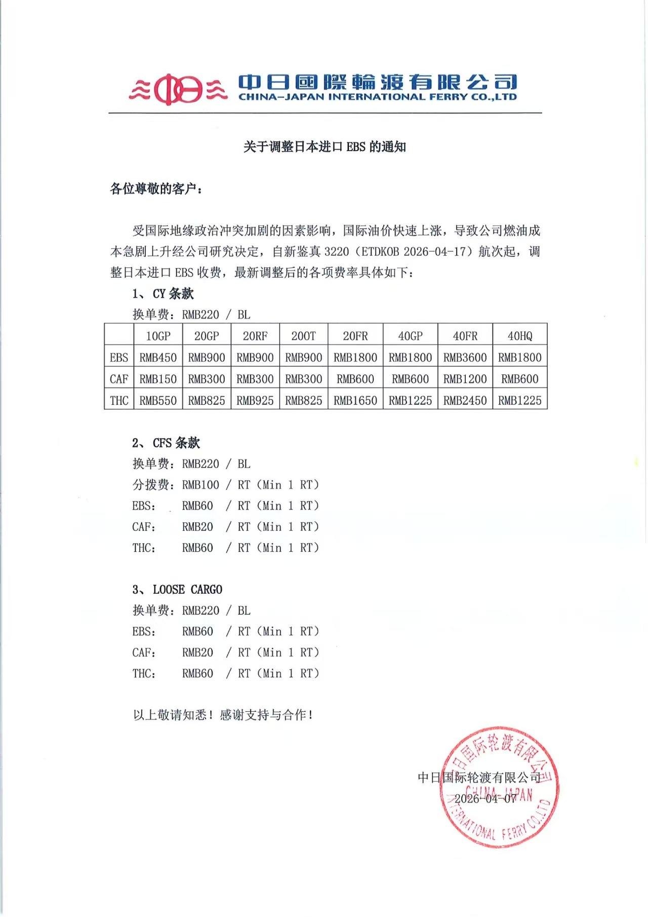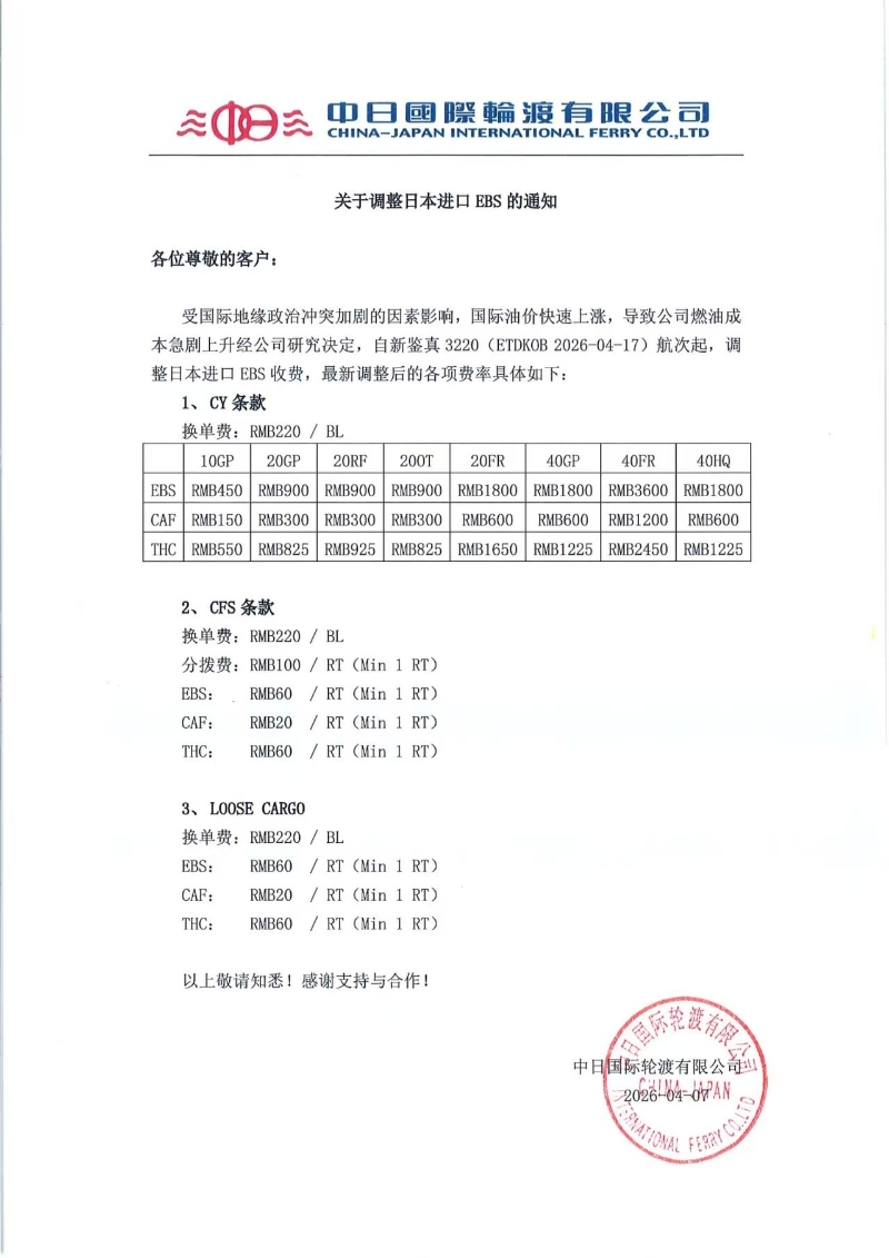 关于调整日本进口EBS的通知